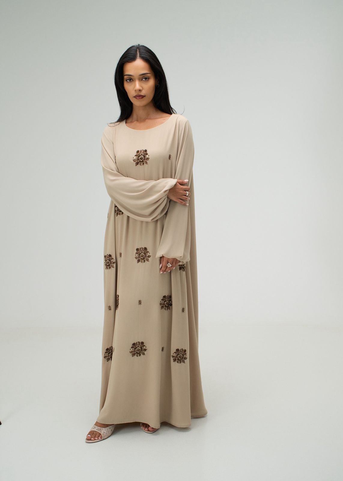 Scattered floral embroidery in rich, tonal hues defines this design, elevating a minimalist aesthetic through artisanal motifs. Relaxed sleeves and a graceful fall offer an understated luxury that feels both grounded and regal, ensuring a sophisticated silhouette with every movement.